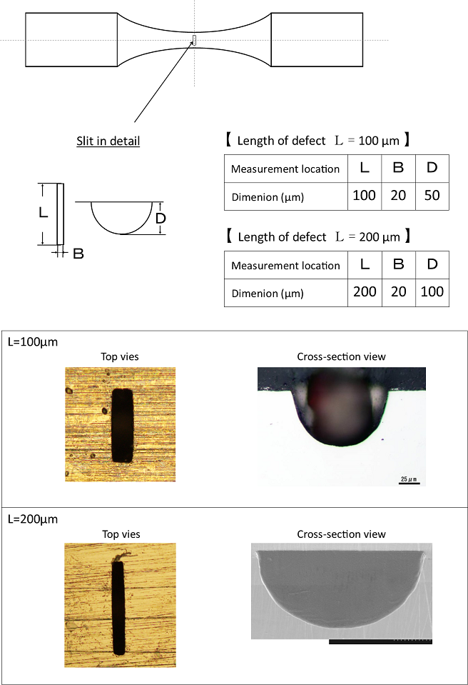 Our laboratory has established technology to machine a semi-elliptical surface slit (an artificial defect). The machining is controlled by small-amplitude pulse of low-peak current.